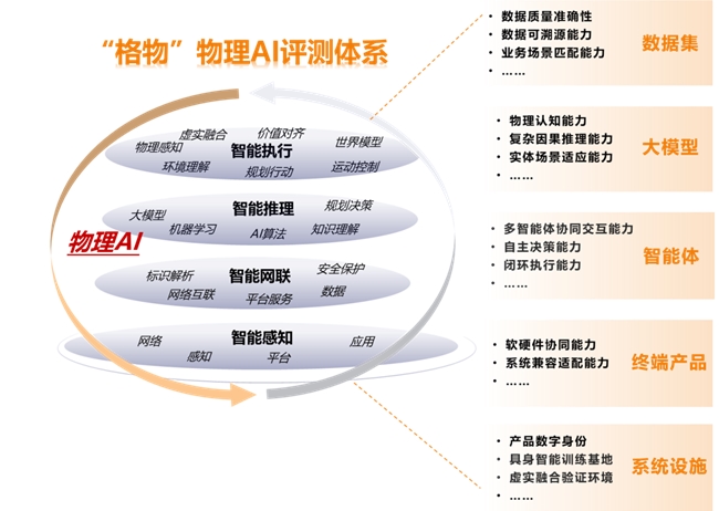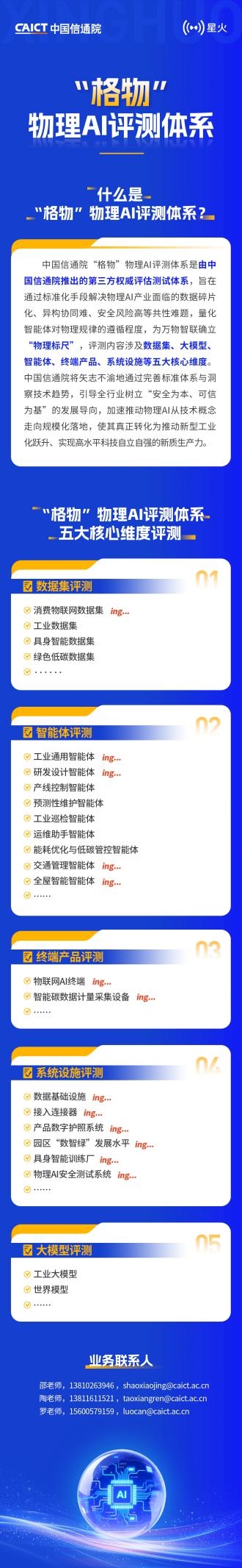 五维全栈架构,定义“物理智能”新范式 “格物”体系创新性地确立了“数据集-大模型-智能体-终端产品-系统设施”的五维全栈架构,实现了从数据底座到系统设施的闭环覆盖: 1. 数据集评测:打破单一文本语料局限,建立涵盖工业机理、传感器时序、3D点云及触觉反馈的“多模态物理数据集”质量评价标准,解决行业高质量训练数据匮乏难题。 2. 大模型评测:面向工业大模型及具身世界模型,重点评估模型对物理一致性的认知水平及复杂因果逻辑推理能力,验证其在实体场景中的“懂行”程度。 3.智能体评测:发挥制造业数据互联互通优势,聚焦异构智能体间的通信互操作、多机协同作业及边缘自主决策能力,确保多智能体在复杂环境下的高效协作。 4. 终端产品评测:将AI性能纳入硬件质量体系,针对具身智能机器人、物联网AI终端,开展软硬协同性能与系统兼容适配性测试。 5. 系统设施评测:依托国家级具身智能演练场开展虚实迁移的高保真验证,构建产品数字护照系统评测体系,实现智能体从仿真训练到物理测试的全生命周期数据溯源与合规性认证。 实战验证:聚焦产业痛点,打通物理AI落地“最后一公里” 中国信通院统筹整合前期技术积累,围绕物理AI产业发展的三大核心需求,成功完成了一系列首评验证工作,证明了该体系在推动技术落地与生态构建方面的实战价值。 一是聚焦“智能执行”,确立自主决策基准。面向智能制造与智慧物流等场景,开展“感知-分析-决策-执行”全链路分级评测,验证了异构协同与边缘决策能力,树立行业应用标杆,加速技术规模化落地。 二是聚焦“数据供给”,夯实物理认知底座。针对工业数据流通难题,建立了基于标识解析的数据确权与质量评估机制,不仅规范了数据采集标注流程,更有效提升了物理AI模型的训练效能。 三是聚焦“可信基座”,保障设施互联互通。统筹开展产品数字护照系统与安全接口能力评测,构建了涵盖数字身份认证、指令拒绝机制、功能安全在内的标准化体系,支撑物理AI基础设施安全稳定运行。 展望未来:共建开放共赢生态 中国信通院将依托“格物”体系,将持续深化三方面工作:一是完善标准体系,推动评测范式从单点基准向跨系统互联升级;二是建设评测中心,深化央地协同,加快物理AI评测体系在地方落地,促进因地制宜的数据智能服务产业创新探索;三是引导产业风向,常态化发布评测榜单与技术洞察,培育壮大开放共赢的物理AI创新生态。 构建新质生产力的基础设施 中国信通院将依托“格物”体系,着力将物理AI评测打造为支撑制造强国、网络强国建设的关键质量基础设施。我们将坚持创新发展与安全治理双轮驱动,让安全、可信、可控成为发展新质生产力的鲜明底色,与产业各界同频共振、携手并进,共同谱写万物智联时代的崭新篇章。